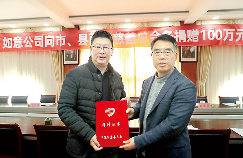 近日,位于浙江省寧波市寧海縣的寧波如意股份有限公司(以下簡稱如意公司)舉行慈善捐贈活動,向市縣兩級慈善總會分別捐款100萬元。寧波市慈善總會常務副會長周忠賢,寧海縣委常委、副縣長郭文魁參加。